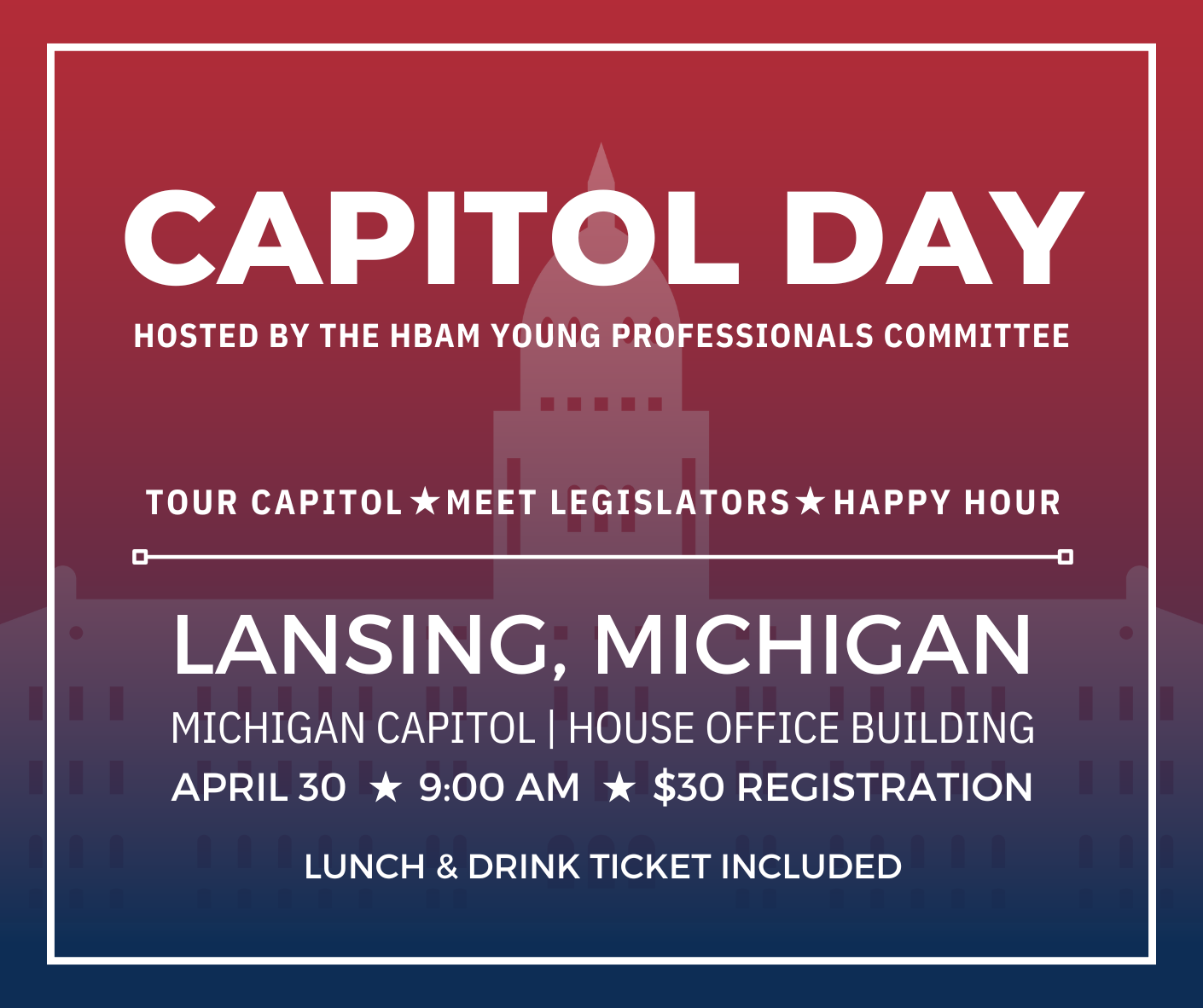 You're invited to our second annual Capitol Day hosted by the Young Professionals Committee! All are welcome to join us in Lansing on April 30, 2026 to get an inside look at how state policies impact housing and connect with the lawmakers shaping our industry. The event will offer a chance to tour the Michigan Capitol, meet with legislators and discuss HBAM’s legislative priorities for the 2025/2026 legislative session. This is an opportunity to see firsthand how policy impacts home building in Michigan and how you can be part of the conversation. To close out the event, we’ll head downtown for happy hour. Your $30 registration includes lunch and your first drink at happy hour.